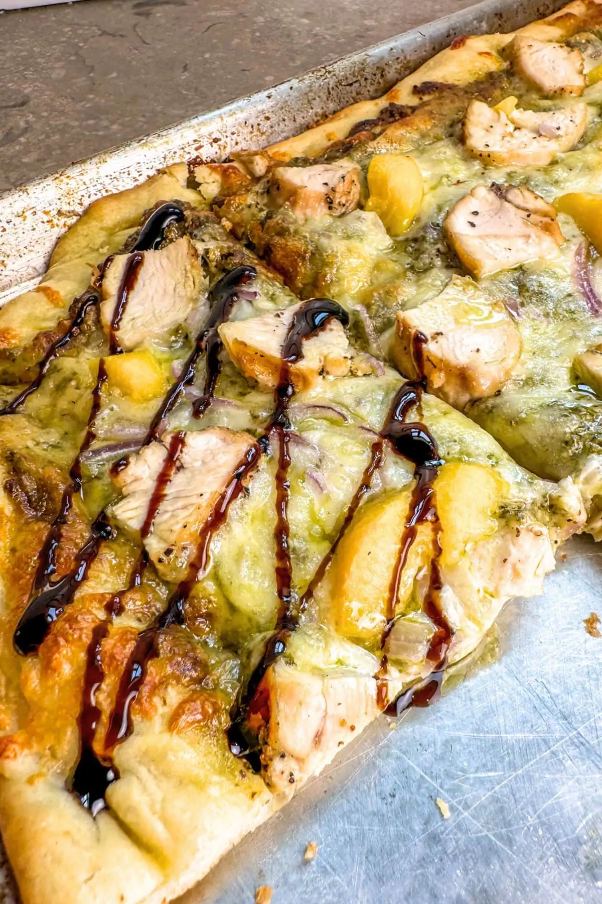 Chicken, Peach, and Pesto Pizza with Balsamic Glaze