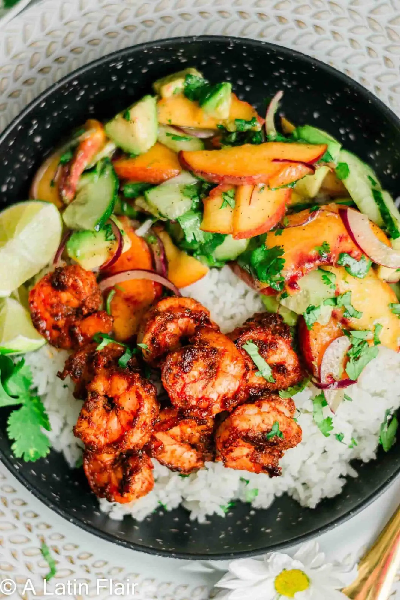 Spicy Shrimp Bowl with Rice and Peach Avocado Salad
