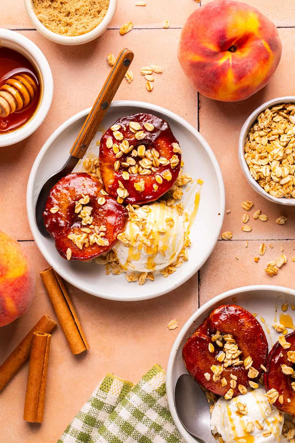 Grilled Peaches are a great summer dessert that stars the delicious taste of fresh peaches. If you’re already out grilling, it’s the perfect way to get dessert on the table without a bunch of extra work. Just toss them on the cold side of the grill, and let the fire do the work! Enjoy these warm, cinnamon peaches with a scoop of cool vanilla ice cream. You’ll get the best results when peaches are in peak season and perfectly ripe. Serve them warm with a scoop of ice cream for a great temperature contrast. You can also chill them and serve them later with Greek yogurt or even whipped cream.